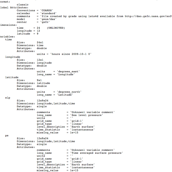 Displays all information about what is contained in the NetCDF file including, but not limited to, variable names, variable sizes, dimensions, units, and missing value codes.