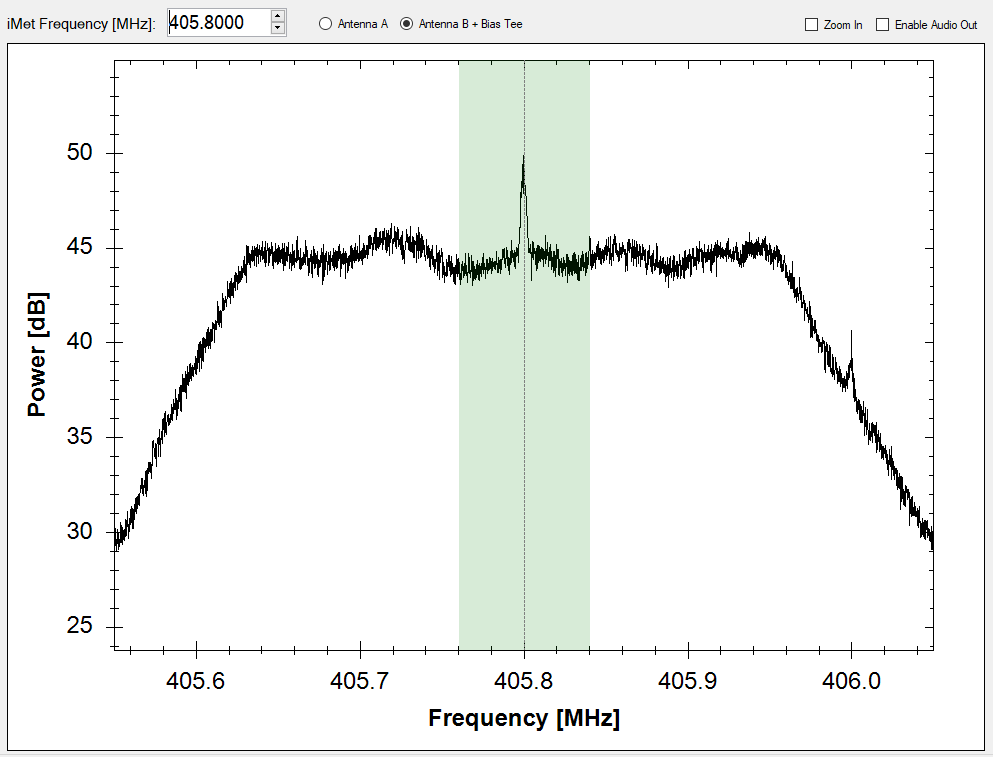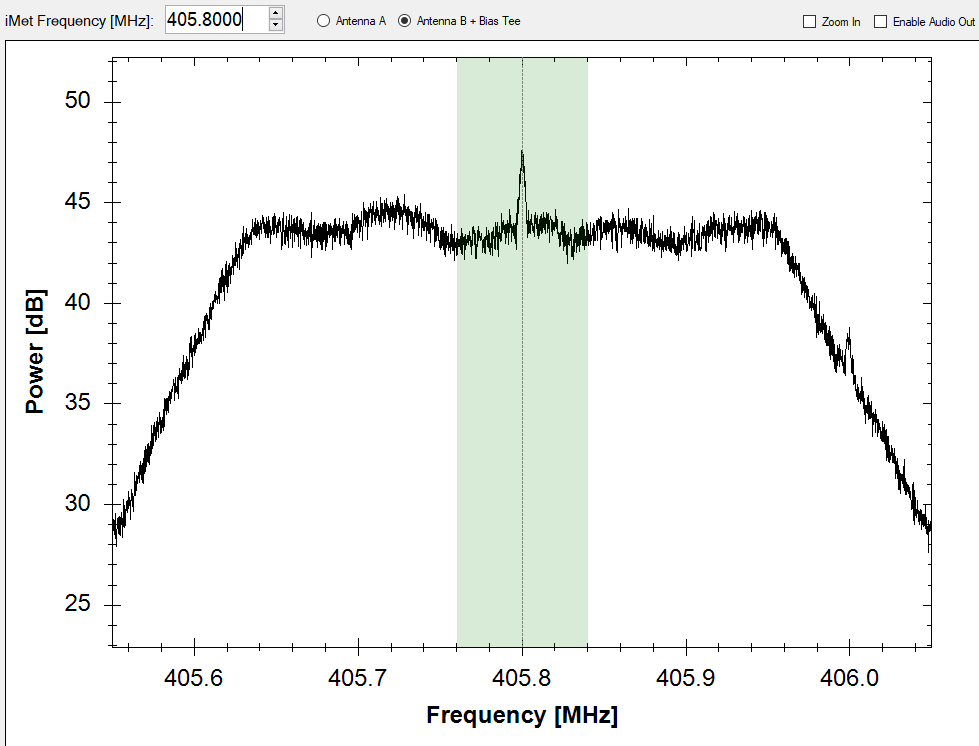 Using iMet software, was able to check and see if any notable interference was showing up near the frequencies sonde was operating at, there was none (see photo below). As can be seen, the dB readout near and around the frequency being tested (405.8 MHz) was relatively uniform.